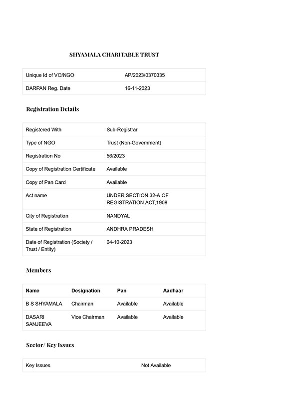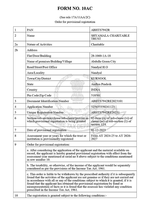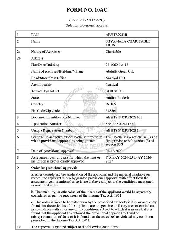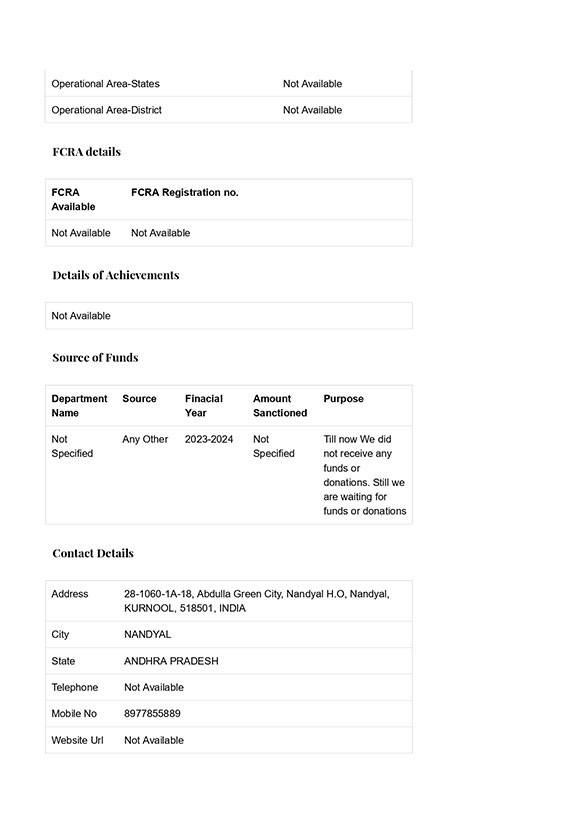 Our trust is a registered and approved organisation under Section 80G(5)(VI) as a non-government organisation. If any individual or organisation would like to contribute their funds for the activities taken up by the trust and NGO in Nandyal , we avail: